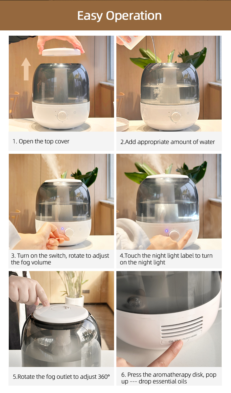 استفاده از مرطوب کننده آروماتراپی اولتراسونیک جدید ما با ظرفیت 5 لیتر در هتل برقی خانگی استفاده شما را ایمن تر و صمیمی تر می کند. نسبت به مرطوب کننده های معمولی نرم تر است و مزاحم مطالعه، کار و استراحت شما نمی شود. پر شدن بالای مخزن آب، راحت و سریع، مخزن آب شفاف، سطح آب قابل مشاهده است. مه نانو ریز 300 میلی لیتر در ساعت، حداکثر مه می تواند 8 ساعت اجرا شود، حداقل مه می تواند 50 ساعت اجرا شود، می تواند آروماتراپی برای تسکین خلق و خوی شما اضافه کند. بدنه رطوبت ساز مجهز به چراغ شب مستقل است تا شب شما سرشار از امنیت باشد.